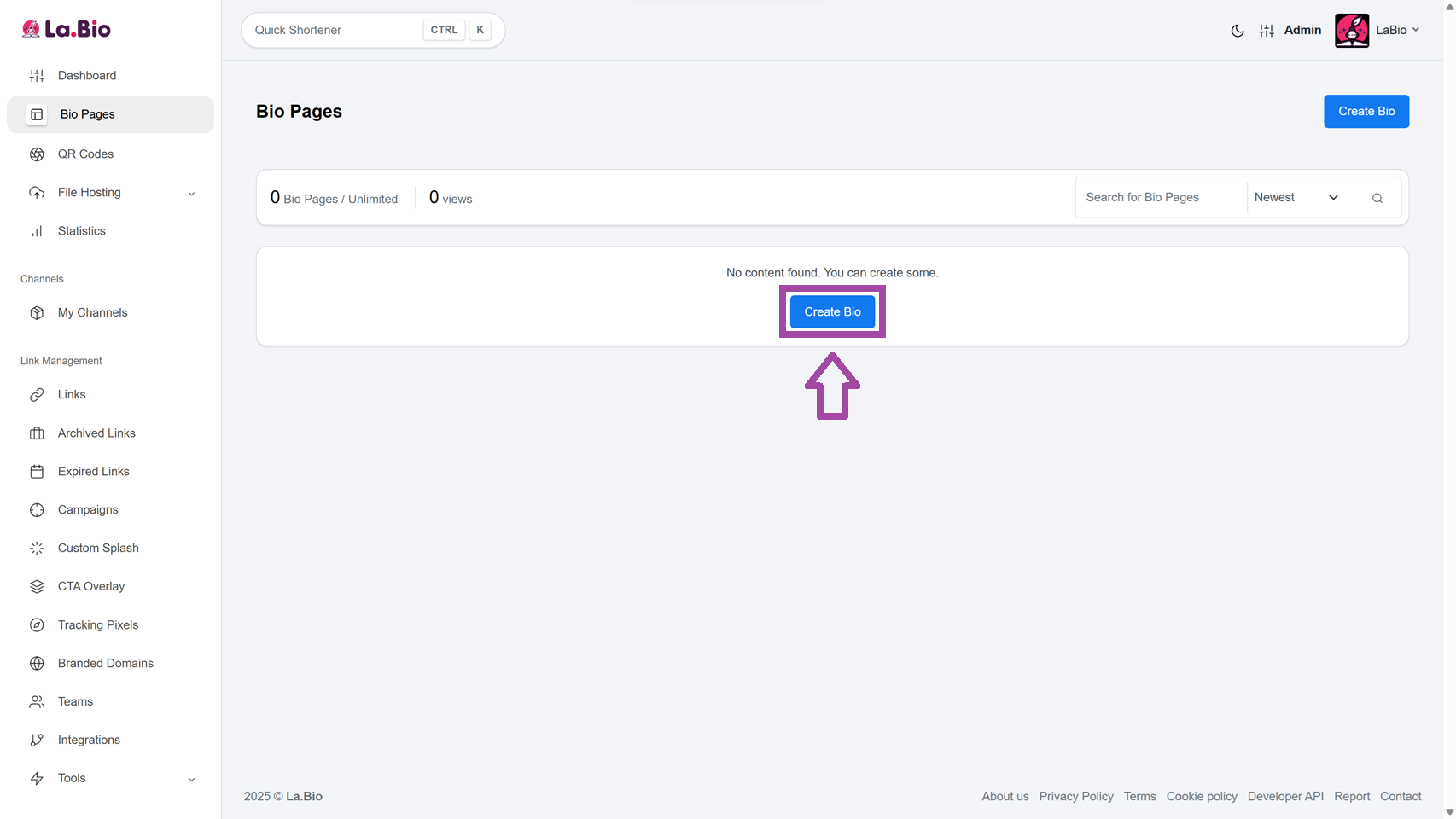 Step 1: Log in to your La.Bio dashboard and click on the "Create Bio" button to start a new project.