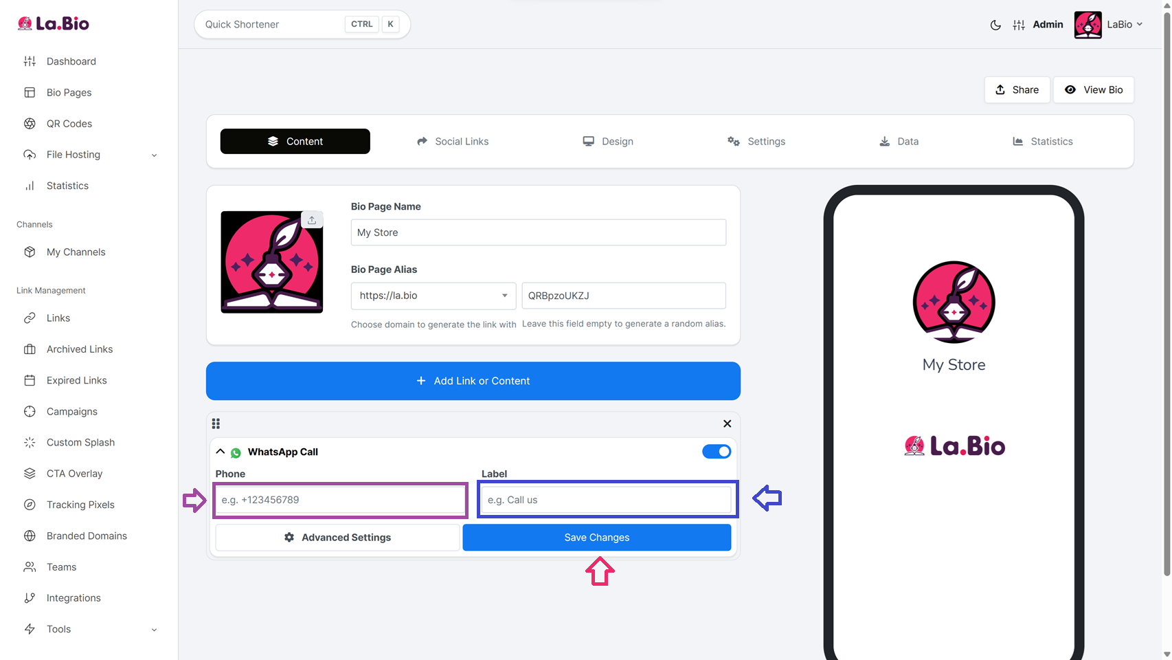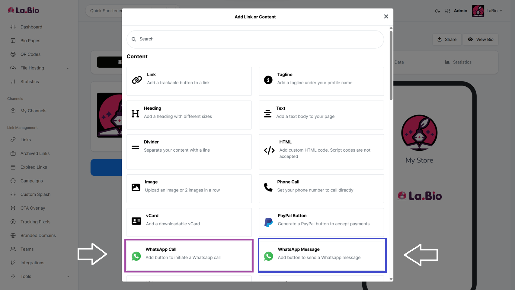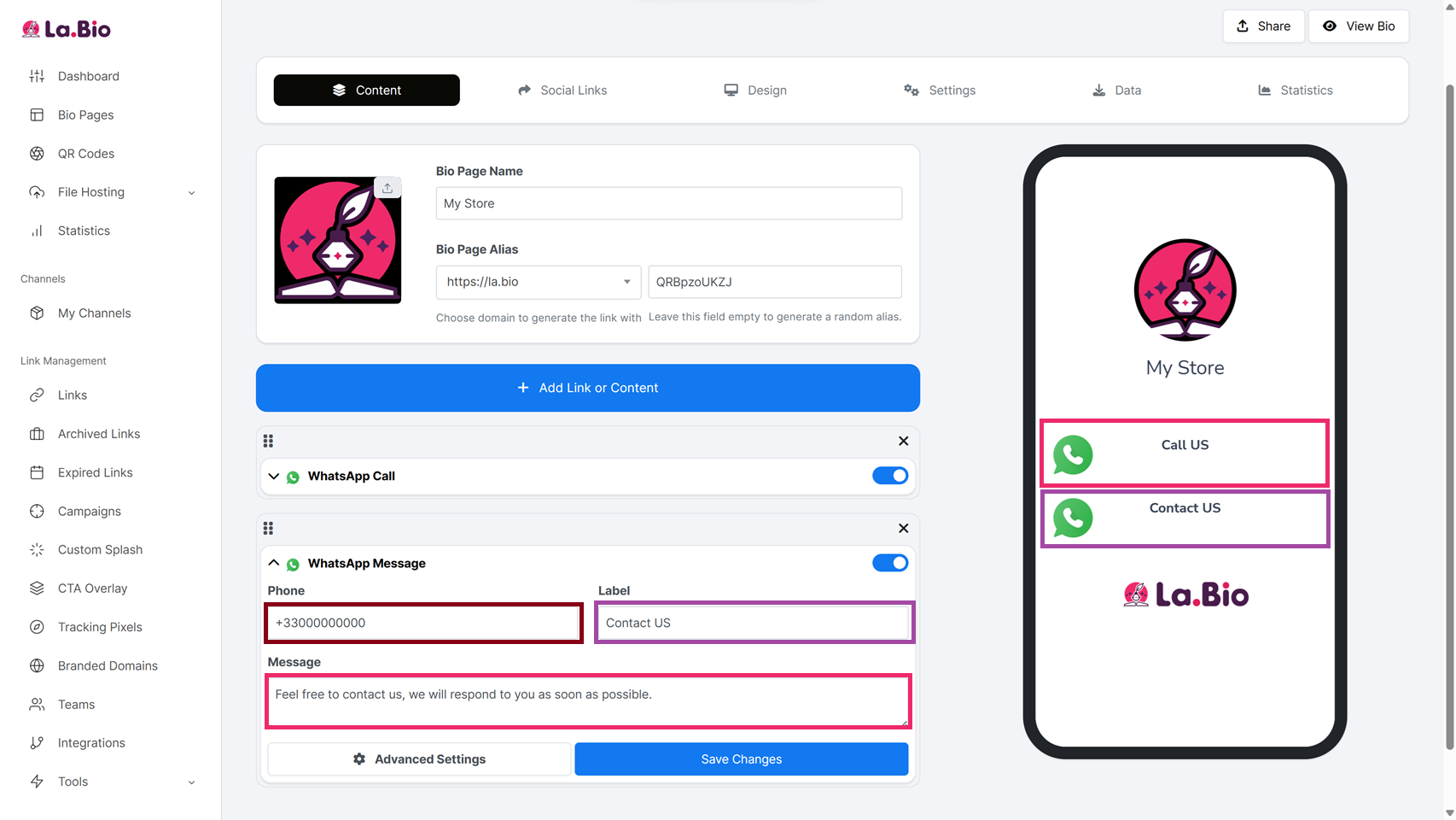 Quick Answer: To add a WhatsApp button, create a page on La.Bio and click 'Add Link or Content'. Choose 'WhatsApp Message' to start a chat or 'WhatsApp Call' for direct calls. Enter your phone number, add a label, and click save. Your visitors can now contact you in one tap.