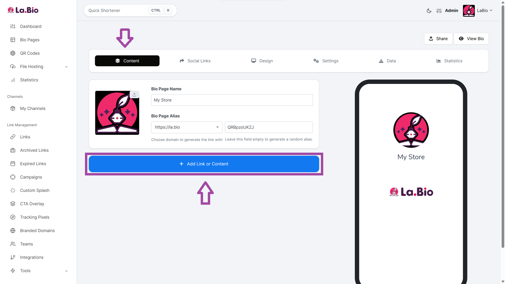 Step 3: Once your page is created, navigate to the "Content" tab. Click the purple "Add Link or Content" button to open the blocks menu.