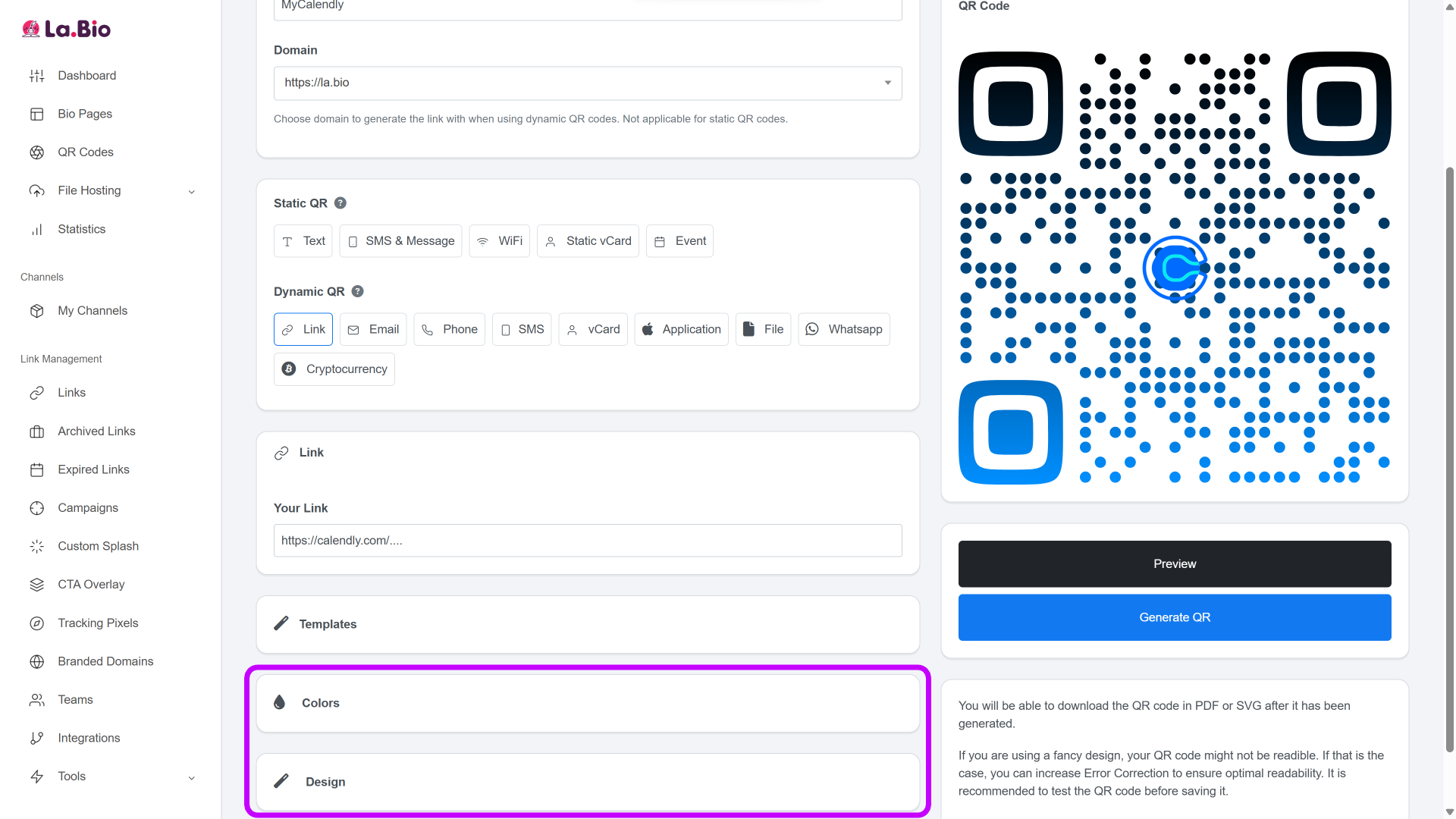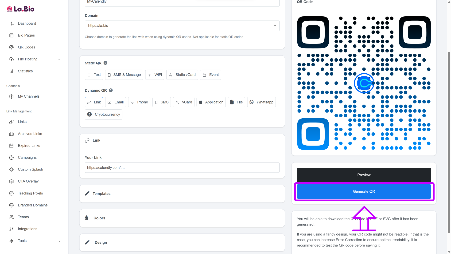 Select Dynamic Link: Choose the "Link" option under the Dynamic QR section, and paste your unique Calendly link into the destination field.