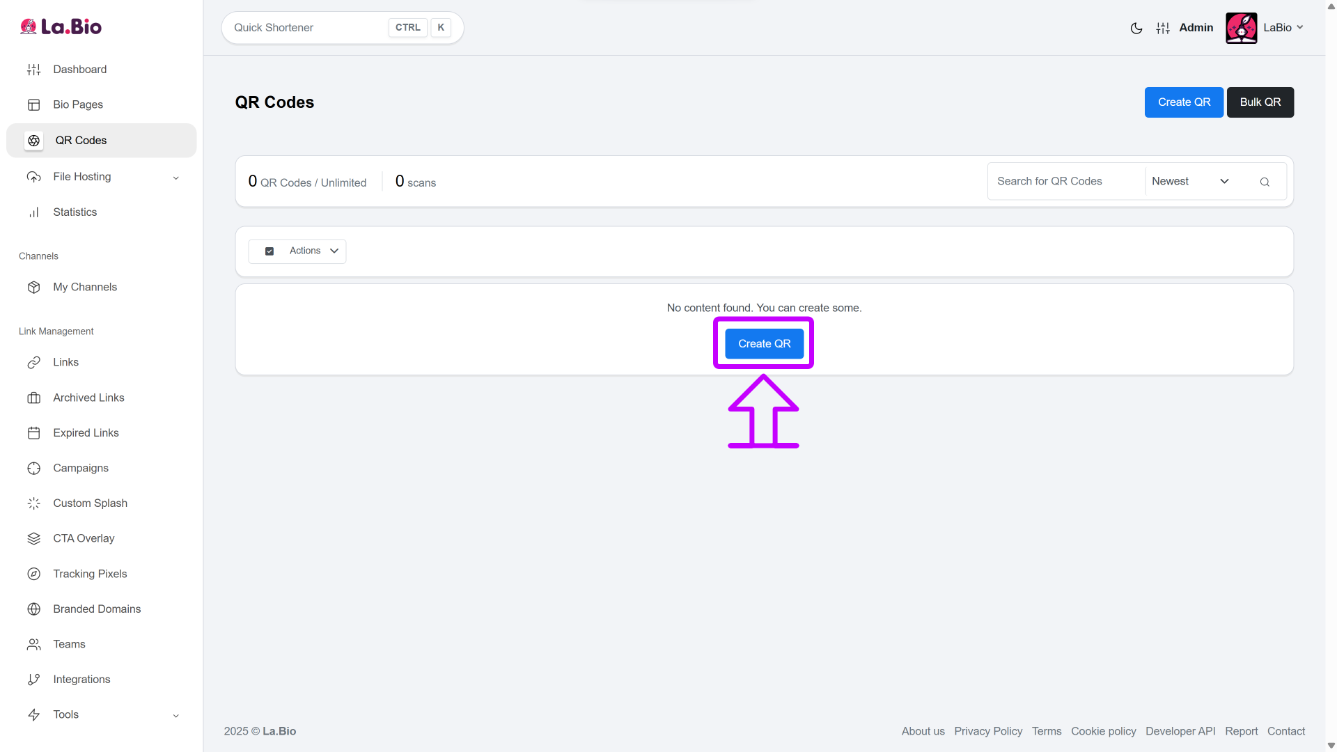 Start the Process: Log in to your La.Bio dashboard and click on the "Create QR" button.