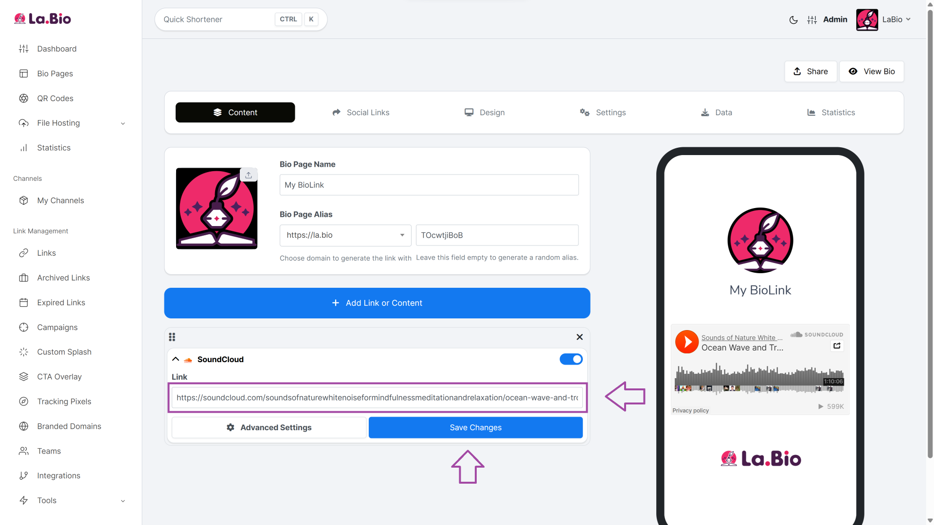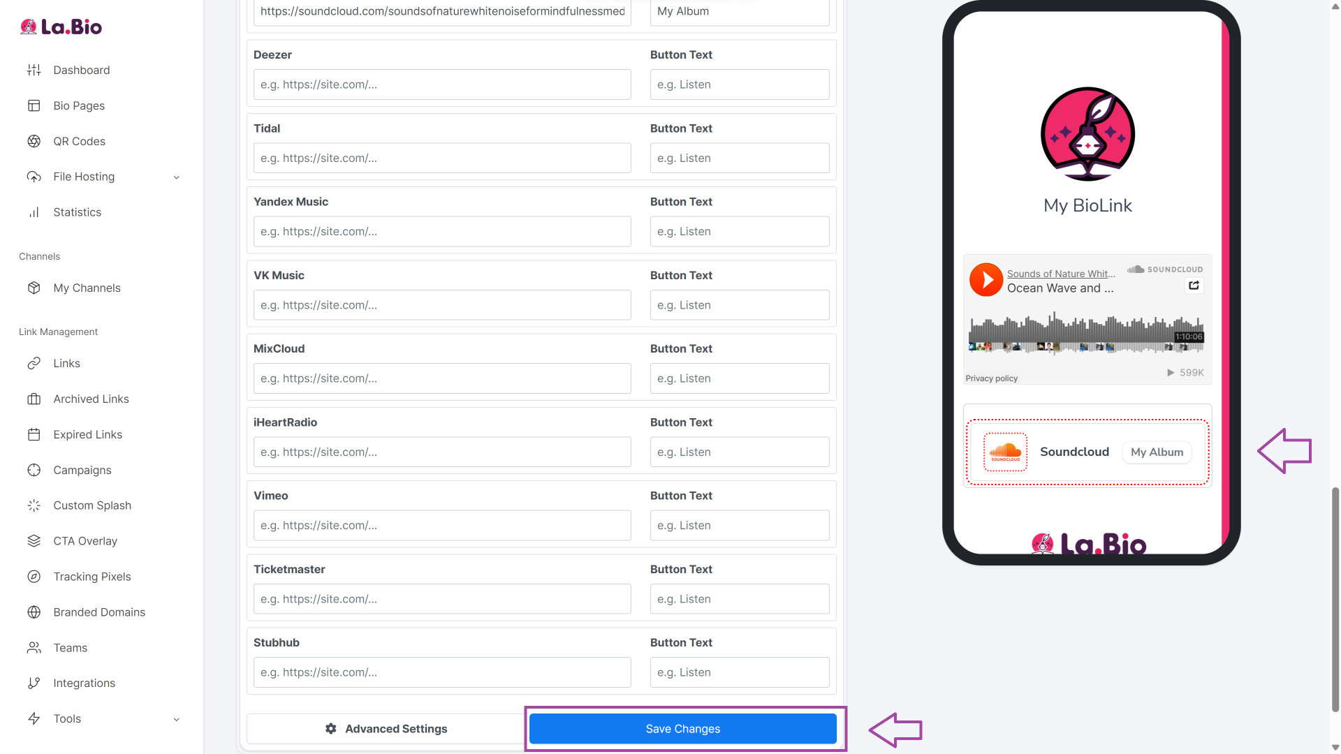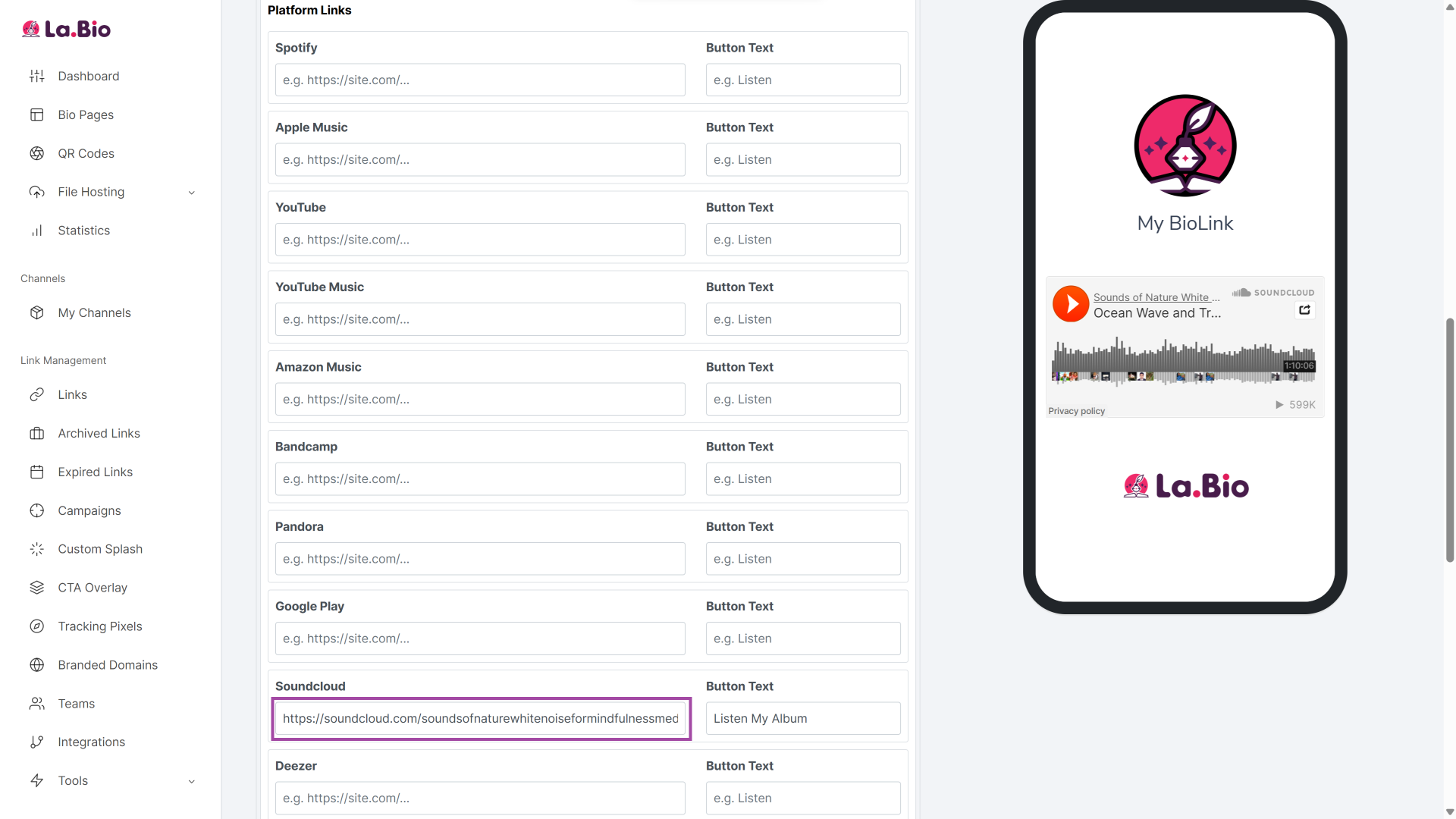 Save: Click "Save Changes". [La.Bio] will instantly generate a clean, professional list of buttons, allowing every fan to choose their preferred streaming service.