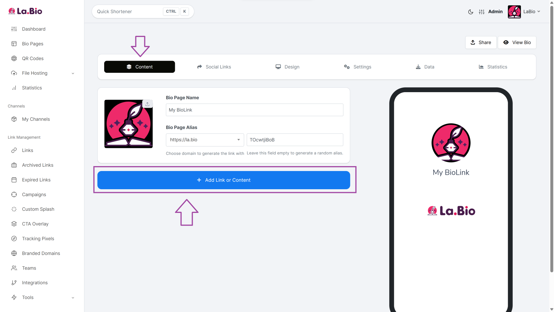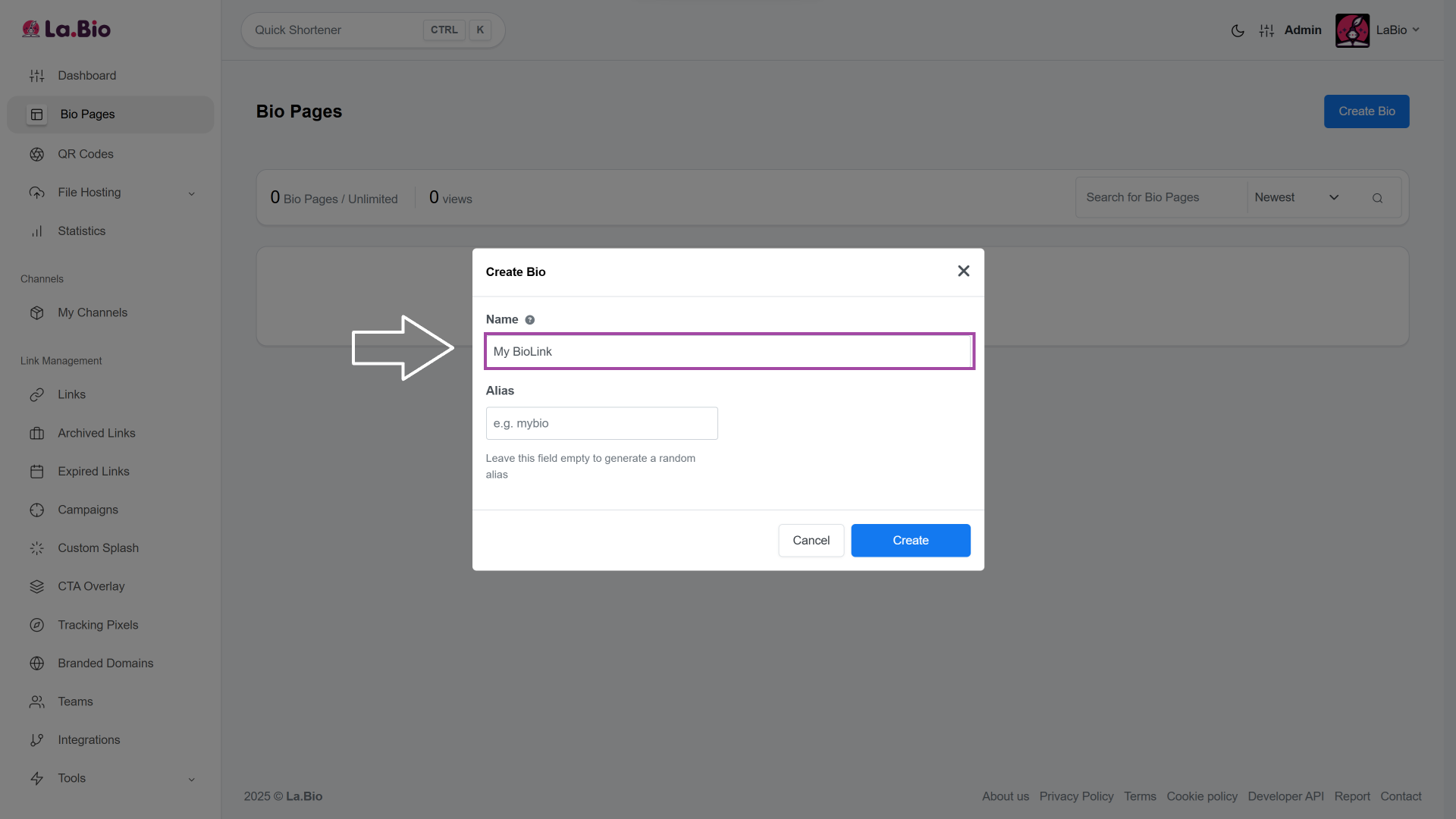 Click on "Create Biolink": Start by initializing your new landing page from your dashboard.