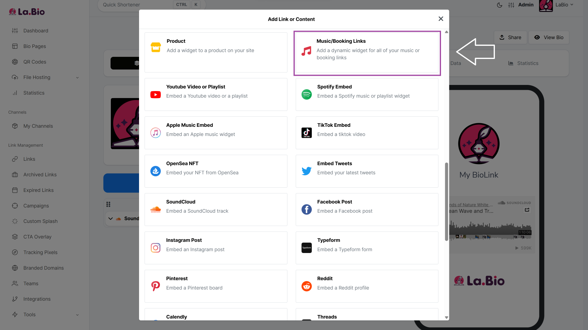Select the Widget: Instead of choosing an embed block, select the "Music/Booking Links" widget block from the content menu.