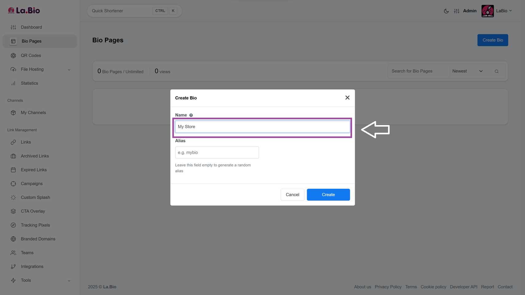 Log in to your [La.Bio] account. If you haven't already, click on Create Bio on your dashboard.