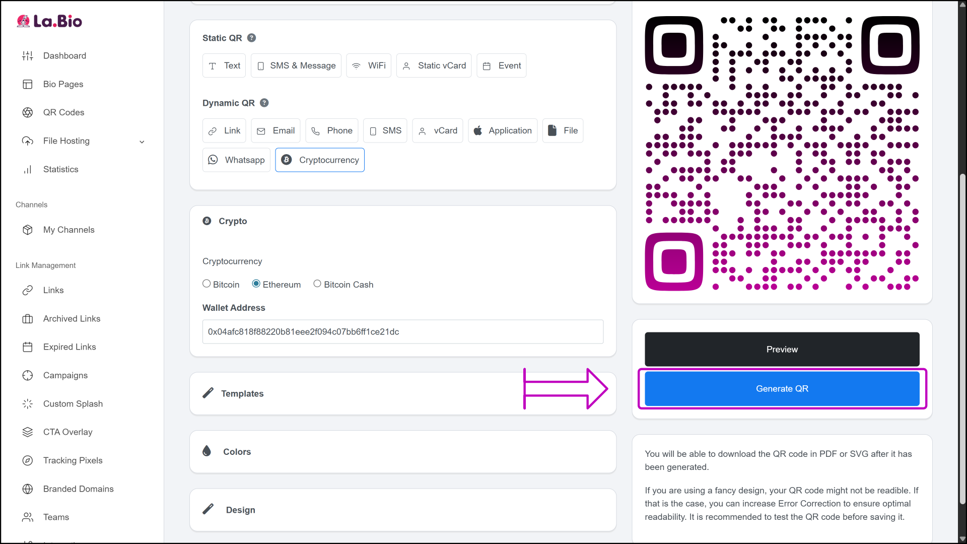 Start accepting Bitcoin and Ethereum securely. [Generate your Crypto QR Code now] with La.Bio.