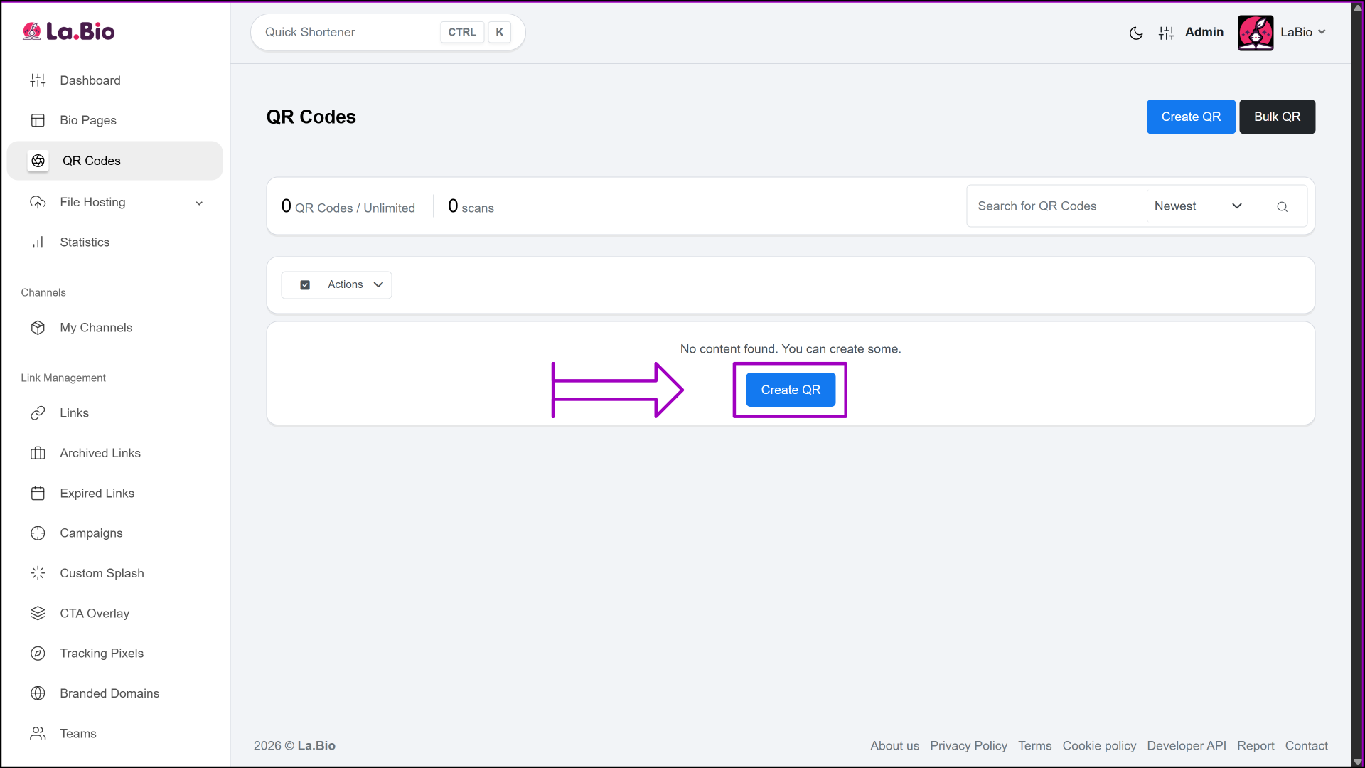 Log in to your [La.Bio] dashboard. On the main overview screen, simply click the "Create QR" button to begin the setup.