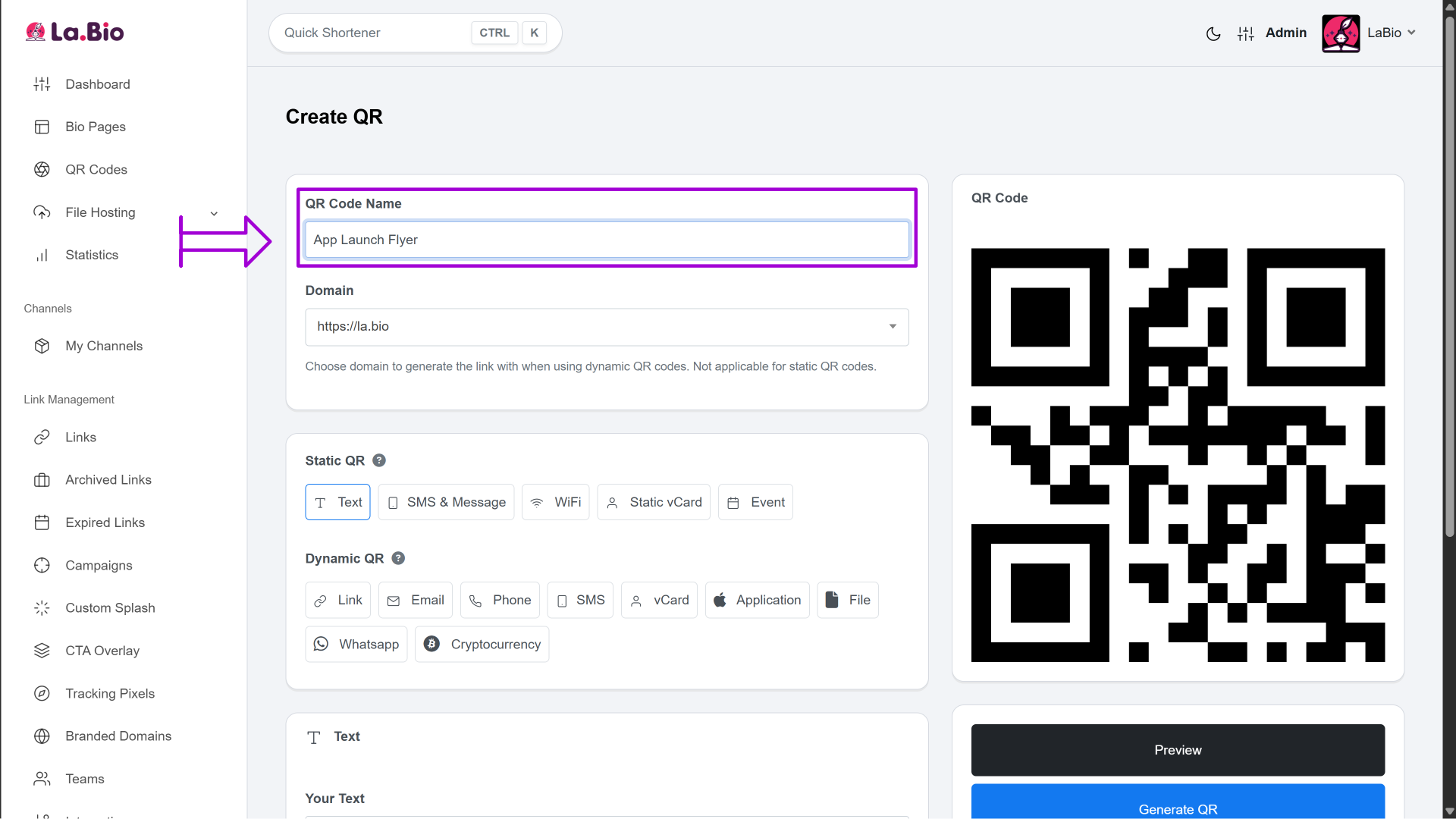 Step 1: Log in to your La.Bio account and click on the "Create QR" button located on your main dashboard.