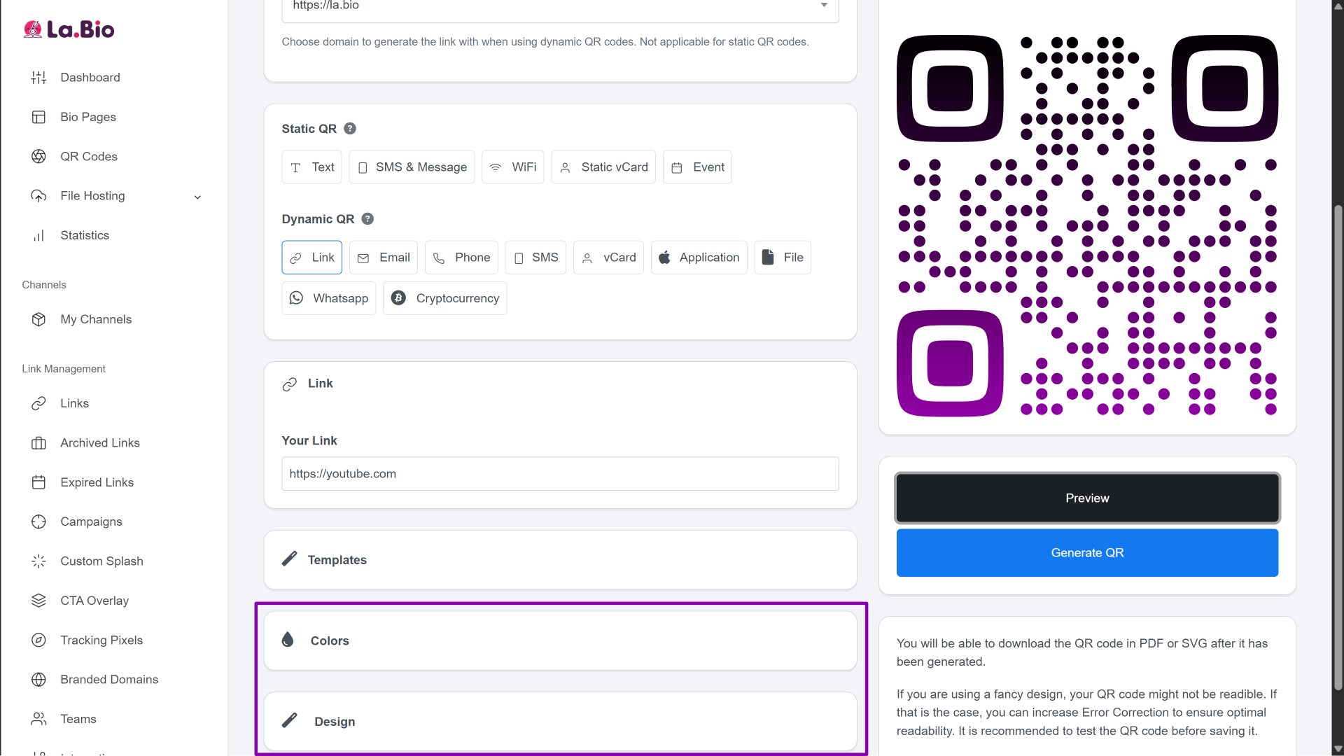 Customize (Optional): Switch to the Design tab to change the QR code’s color or style to match your brand identity.