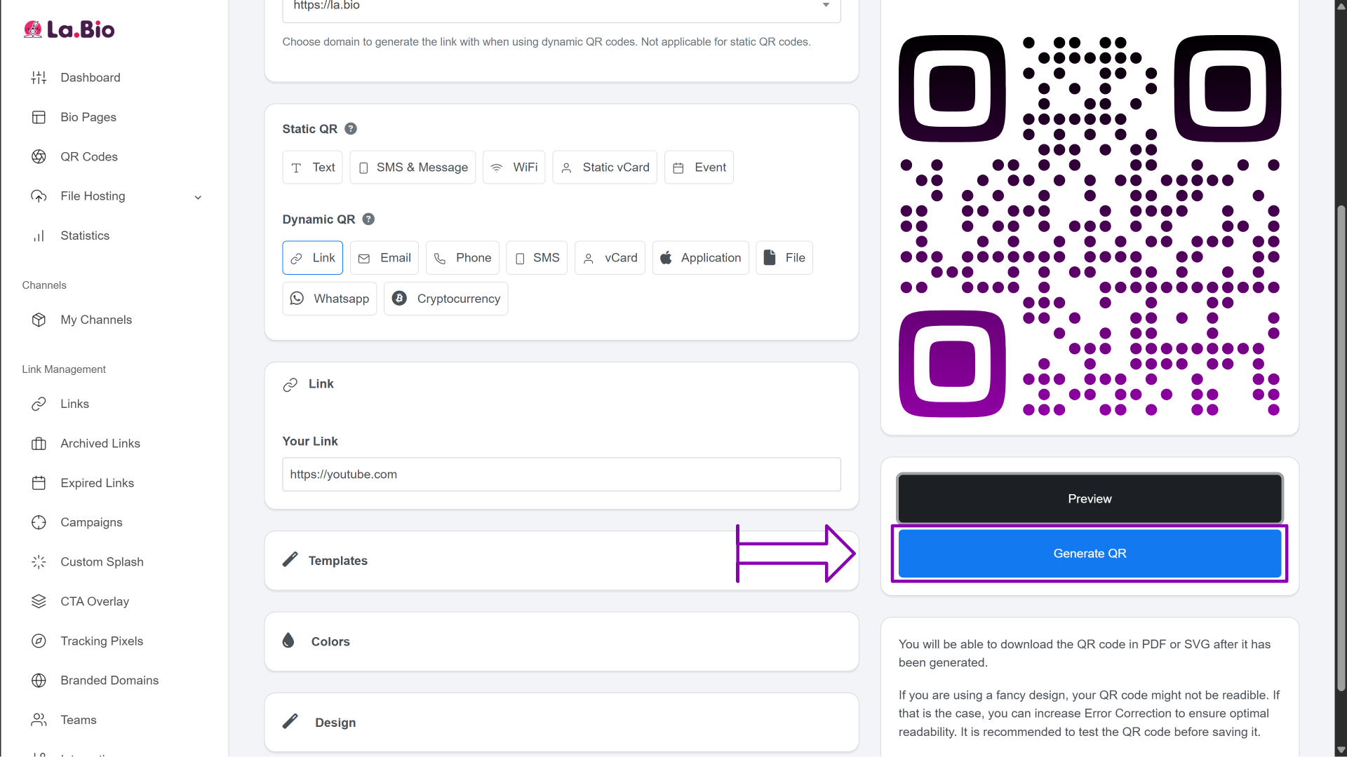 Start: Log in to your [La.Bio] dashboard and click the Create QR button.