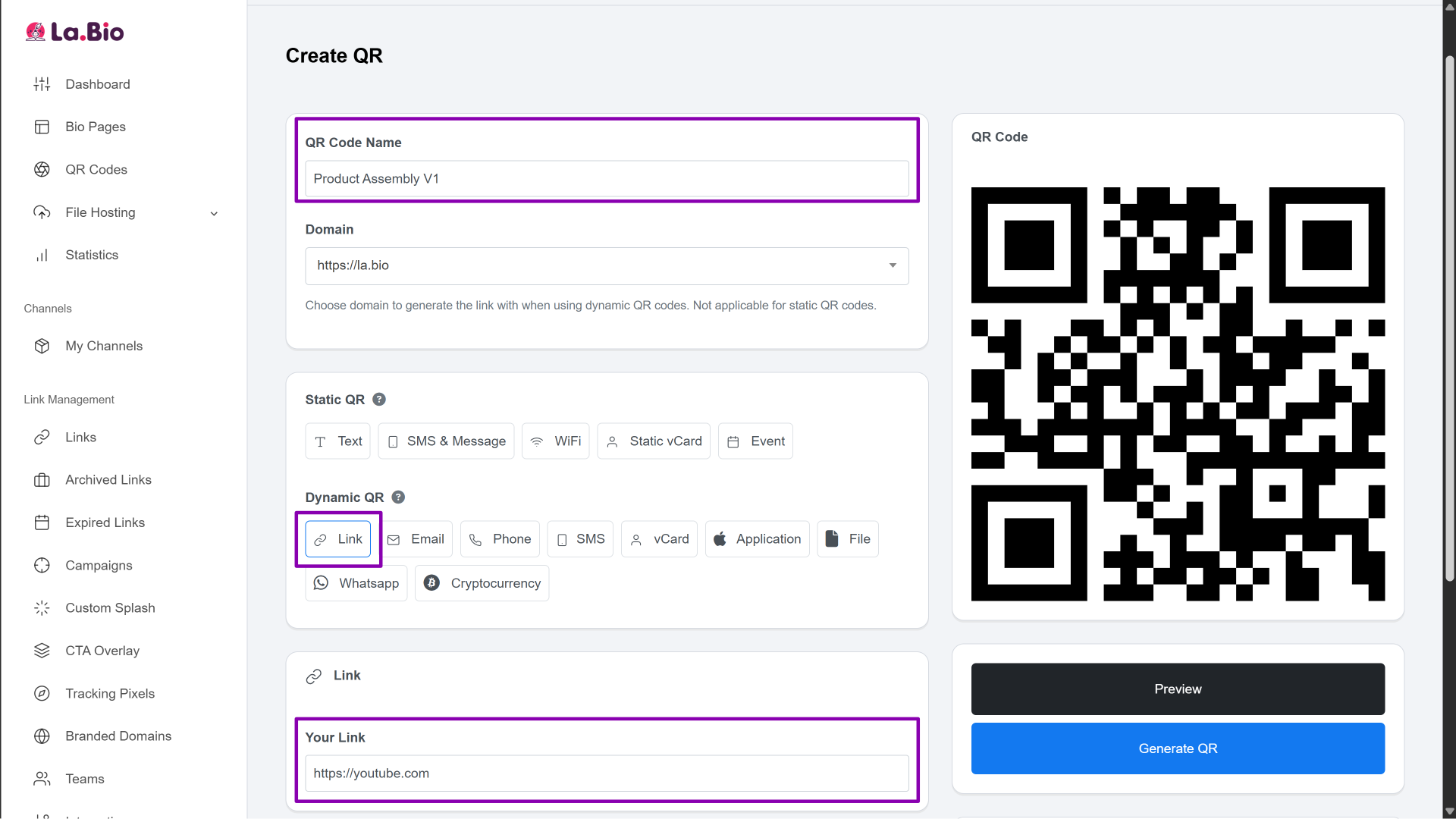 Configure: Give your QR code a recognizable name (e.g., "Product Assembly V1"). Then, locate the Dynamic QR section, select the Link option, and paste your video URL into the field.